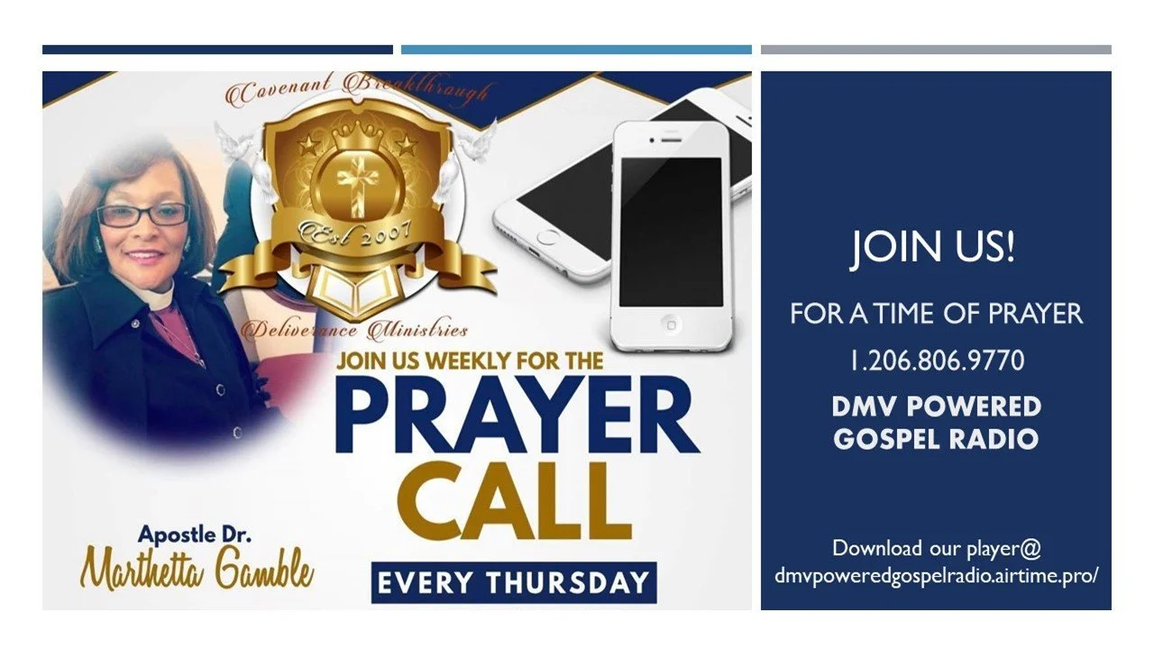Prayer Call at 10 am & 7 pm Est., Monday through Friday with Apostle, Dr. Marthetta Gamble of Covenant Breakthrough Deliverance Ministries and her Co-host; Deaconess Maggie Jordan of Little Ark Baptist Church.